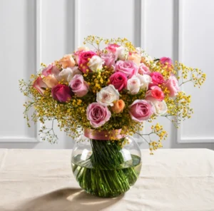 Grab this endearing beauty consisting of light-hued roses & a fragment of delicate gypsos perfectly arranged in a glass vase to bring out the eyeful glimmer in a room full of sights.
